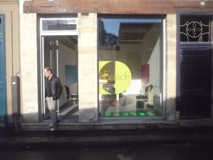 EMF 2 (2012), Version n° 1 (2012) : "Où l'on se joue de l'obstacle", exposition personnelle dans la Galerie Intuiti à Paris ; dispositif scénographique intégrant les Répliques Nos 48, 26 et 22. Vinyles disposés en fonction du bureau : orange (posé au plafond au-dessus du bureau), violet (suspendu), jaune (sur le mur du fond et sur la vitrine), rouge (au sol, sur et dessous le bureau), cyan et magenta (sur les murs latéraux), plexi-miroirs (au sol sous le bureau et suspendu). Curators : Stéphane Mortier et Christophe Gratadou (photographies 1, 2, 3 : Romain Nicoleau ; 4, 5, 6 : Patrice Hamel).