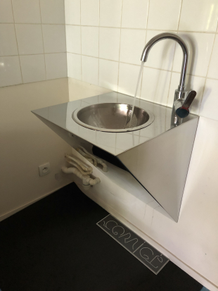 MMF 3 (2001), Version 2 (2014) : vasque en inox poli miroir ; propriétaire : Marie-Paule Feiereisen.Descriptif : deux des côtés du lavabo sont triangulaires, deux autres rectangulaires, la vasque est située au milieu du dessus carré (Photographies : Marie-Paule Feiereisen).